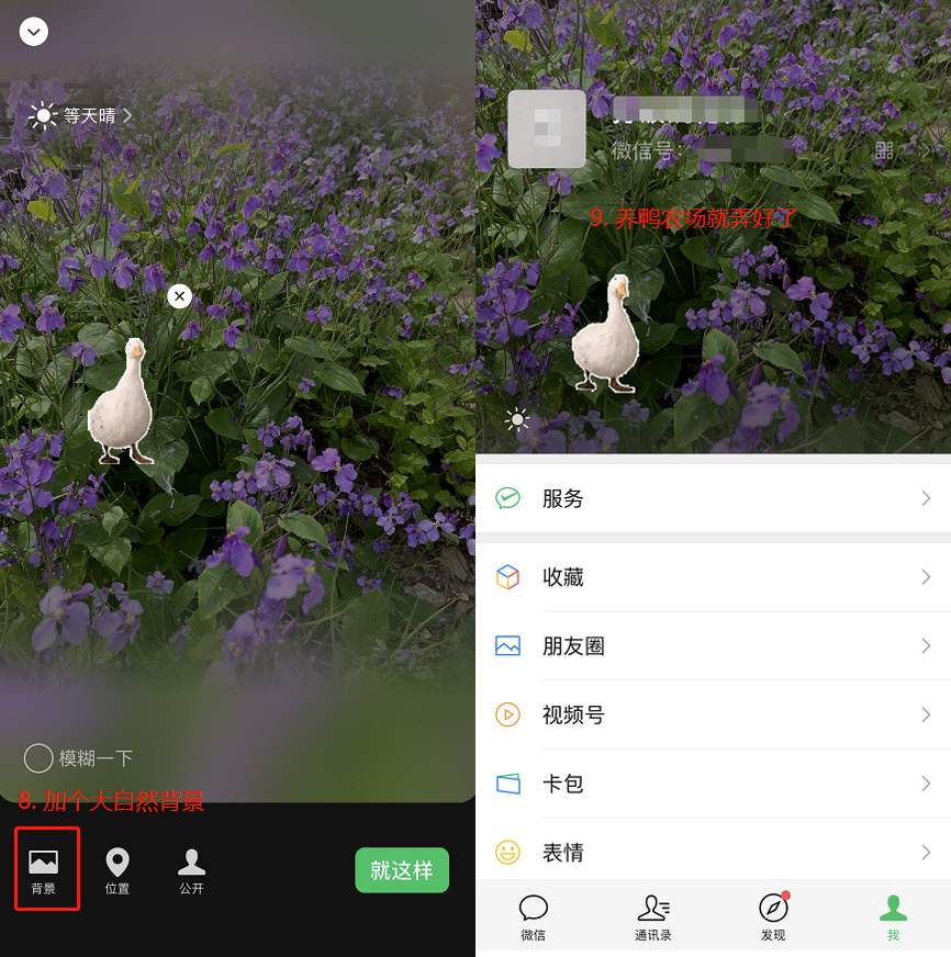 微信可以实现“伪农场”功能,通过状态中设置表情包,就能养各种可爱的动物。