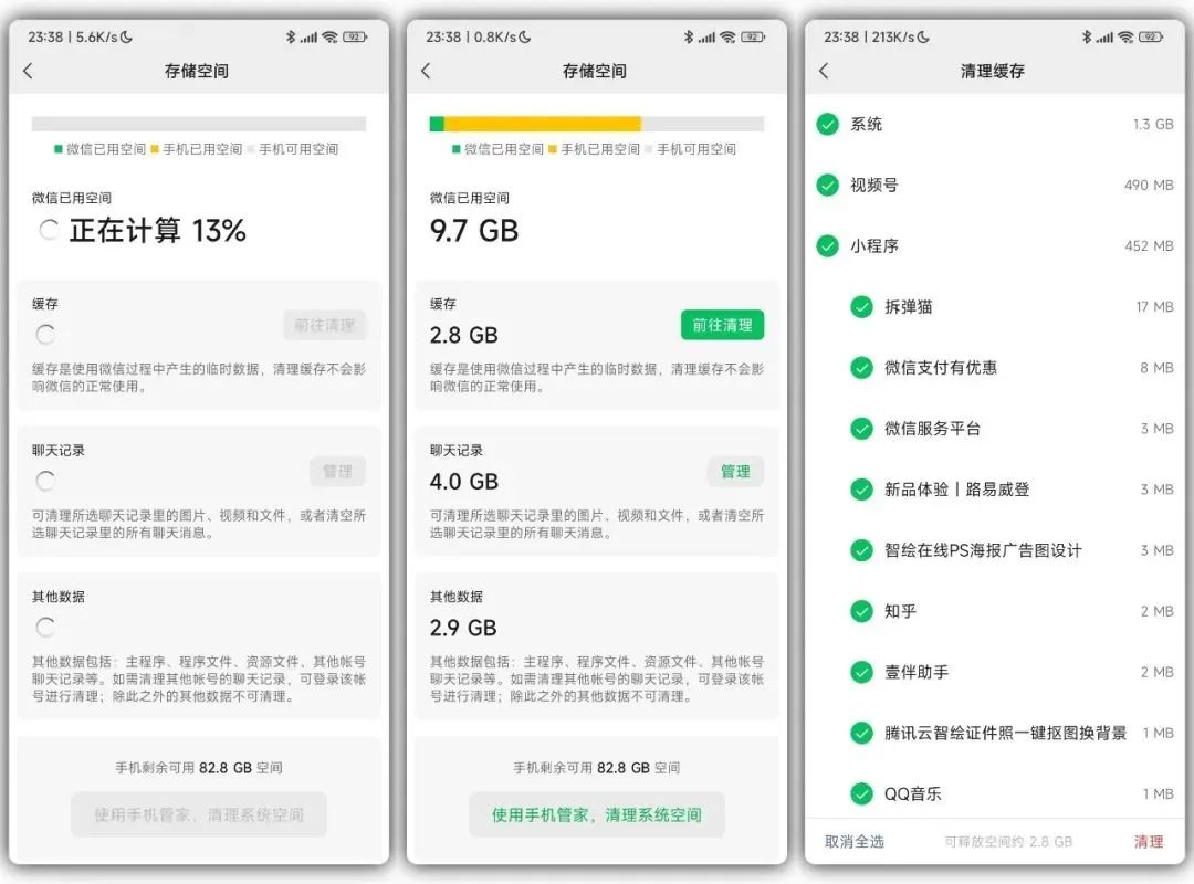 新版本针对这个功能进行了升级,优化了加载空间页面,增加了缓存具体内容,还能清理具体某个小程序的缓存,缓存新增公众号和朋友圈清理。