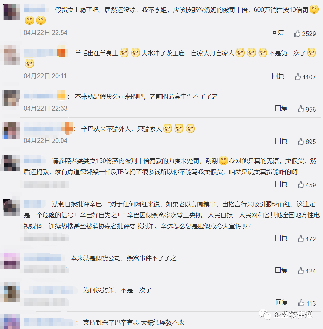 2020年底,辛巴曾因公开售卖“假燕窝”一事而闻名全国,被广州、厦门两地市场监管部门进行调查。