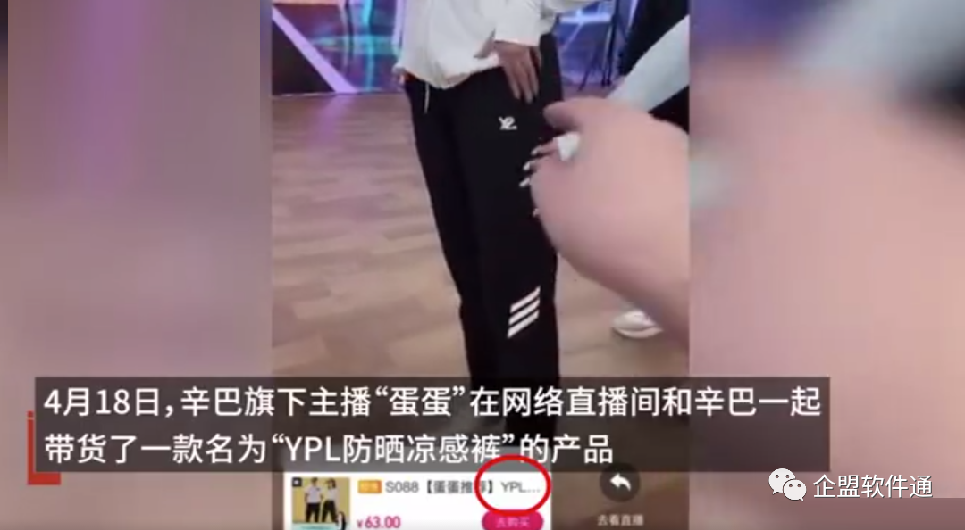 谁知道在今年4月18日,辛巴和旗下主播“蛋蛋”在网络直播间,现身带货了一款名为“YPL防晒凉感裤”的产品。