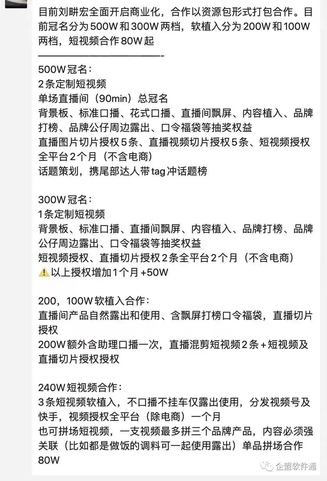 一份流传在各个社群之间的刘畊宏商务报价显示,刘畊宏冠名费用已经达到500万元。