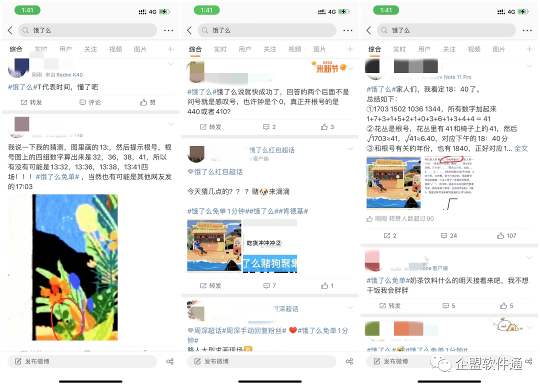 活动规则:饿了么每天会在官博和饿了么订餐平台发布一张图片,图片中的线索指向一组(或几组)时间。用户在这个时间内下单限定品类的外卖,就有可能享受全额免单服务。